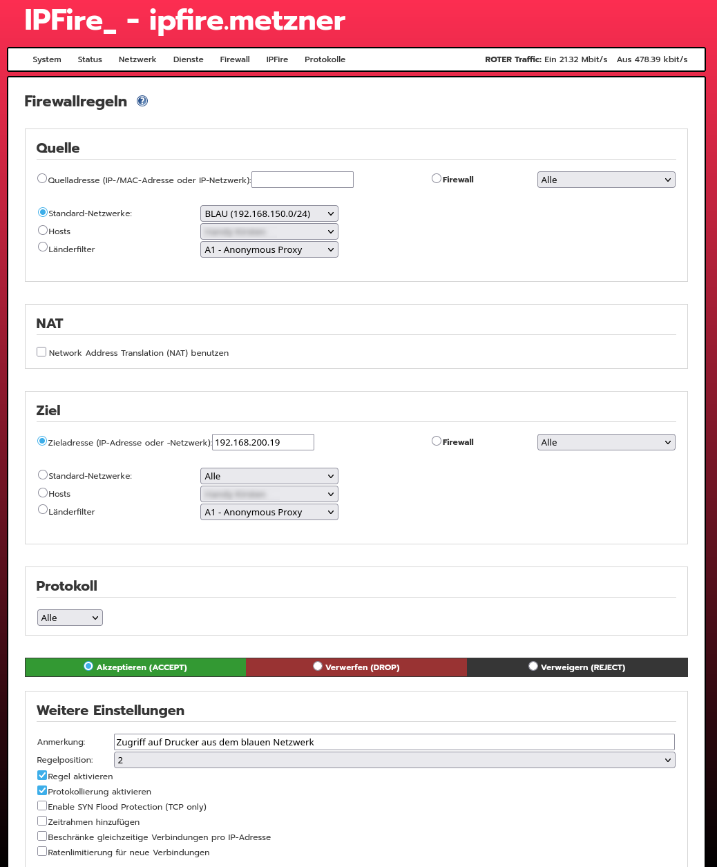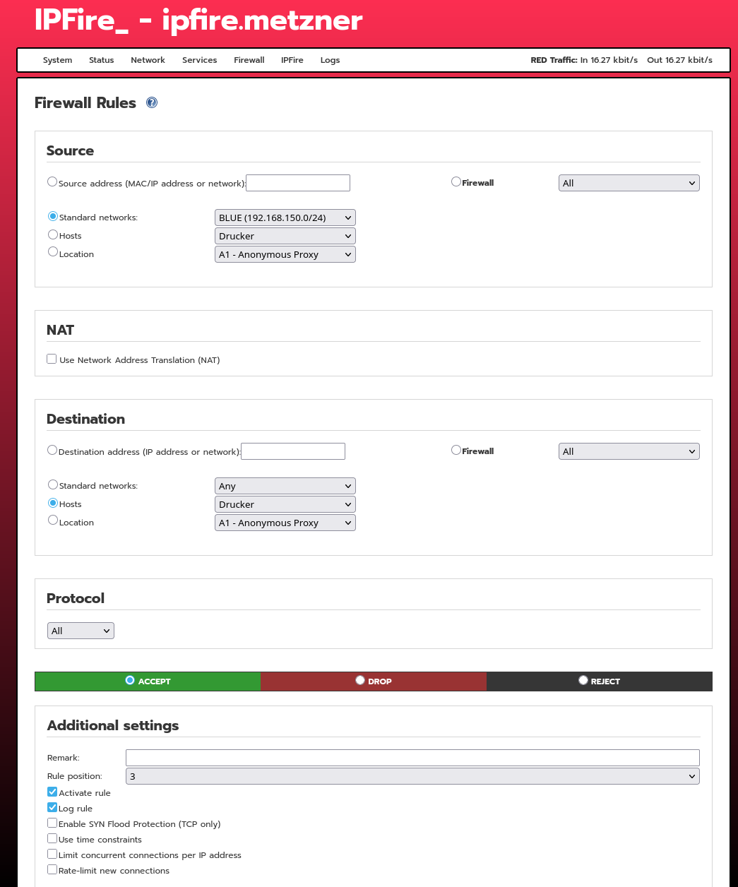 Check the ipfire log; if you’re not finding any trace of the connection (refused or granted) probably traffic is processed before your “new” rule.