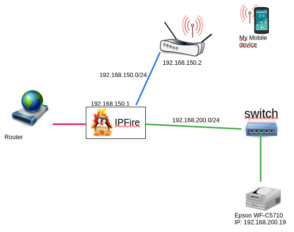 I can ping the printer from a Linux laptop that is also connected to the WLAN (blue network).